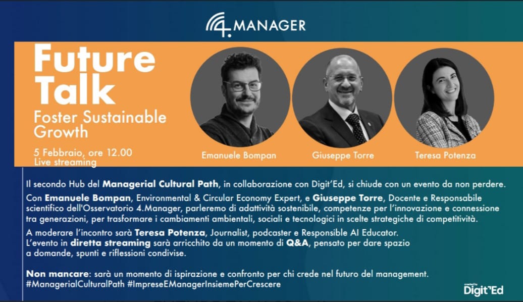 Il 5 febbraio alle ore 12 4.Manager e Digit’Ed organizzano un appuntamento in live streaming a conclusione del secondo HUB dell’iniziativa Managerial Cultural Path.