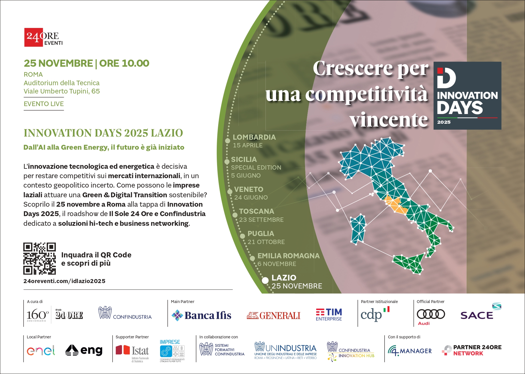 Tappa finale di Innovation Days, il roadshow de Il Sole 24 Ore che attraversa l’Italia per raccontare la trasformazione digitale e la crescita del tessuto produttivo nazionale. Dopo le sei tappe in tutta Italia del 2025, il tour arriva a conclusione con l’appuntamento di Roma, in programma presso Confindustria.