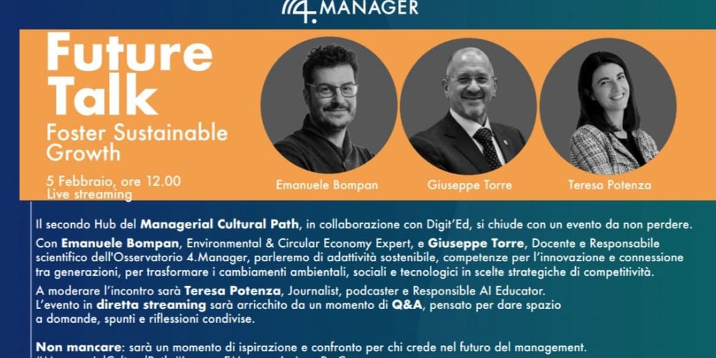 Emanuele Bompan, Environmental & Circular Economy Expert e Giuseppe Torre, Docente e Responsabile scientifico dell’Osservatorio 4.Manager ci parleranno di adattività sostenibile, competenze per l’innovazione e connessione tra generazioni, per trasformare i cambiamenti ambientali, sociali e tecnologici in scelte strategiche di competitività.