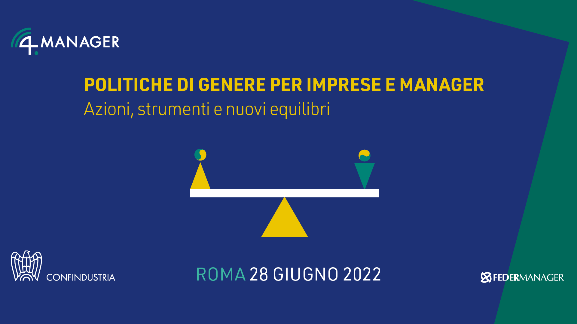 DettagliIl 28 giugno alle ore 10.00 a Roma, presso Confindustria – Sala GH, viale dell’Astronomia 30, si terrà il seminario “POLITICHE DI GENERE PER IMPRESE E MANAGER. AZIONI, STRUMENTI E NUOVI EQUILIBRI” organizzato da 4.Manager. Sono previsti gli interventi del Presidente di 4.Manager e Federmanager Stefano Cuzzilla e della Ministra per le Pari Opportunità e la Famiglia Elena Bonetti. Scarica il…